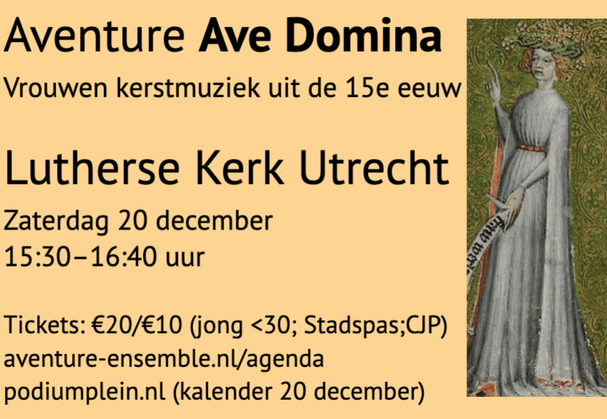 Zaterdag 20 December’25 Ave Domina in Lutherse kerk Utrecht Gepost door:themakingoffillingthegap 11 december 202511 december 2025 Leave a comment on Zaterdag 20 December’25 Ave Domina in Lutherse kerk Utrecht Ave Domina – Vrouwen kerstmuziek uit de 15e eeuwprogramma Tickets & info Dit delen: Klik om te delen op X (Opent in een nieuw venster) X Klik om te delen op Facebook (Opent in een nieuw venster) Facebook Vind-ik-leuk Aan het laden... Gerelateerd